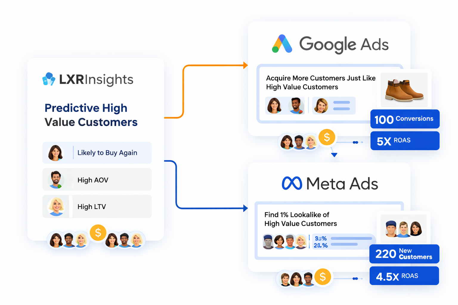 LXRInsights drives acquisition by feeding high-value and predictive audiences into Google and Meta to find and convert more customers who look like your best buyers.